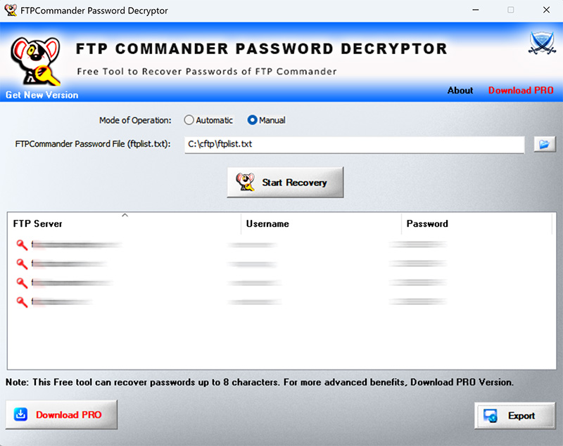 It can recover the FTP passwords from all editions including FTP Commander, FTP Commander Pro & FTP Commander Deluxe. It supports automatic and manual mode, in automatic mode it will instantly scan and recover FTP passwords from all versions of FTP commander. In manual mode, user can specify local/remote password file (ftplist.txt) and recover the passwords.