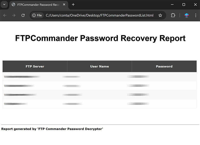 Screenshot 2:  Exported list of of recovered ftp login passwords in HTML format.